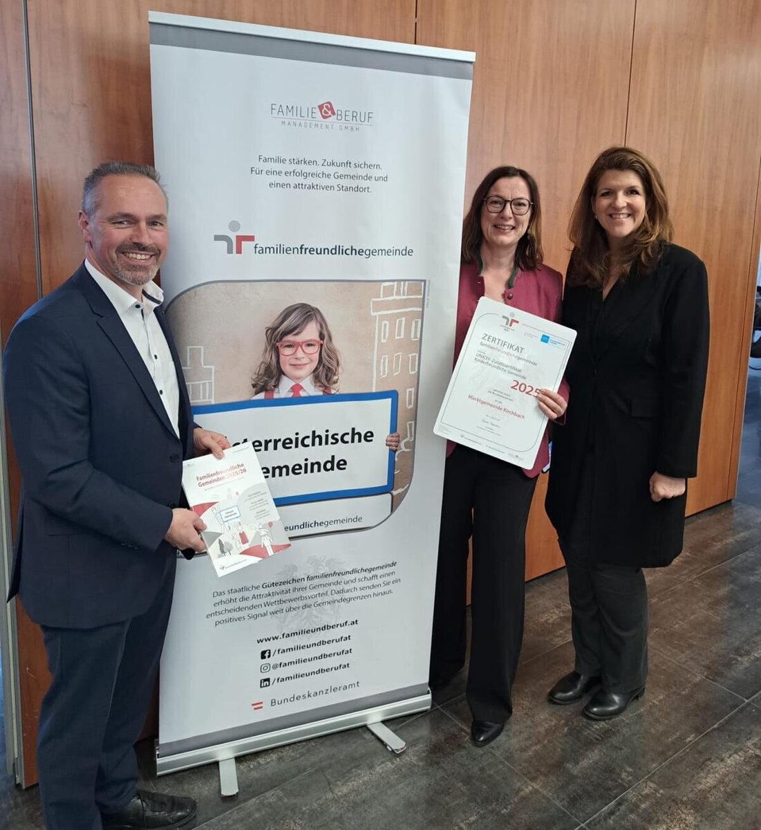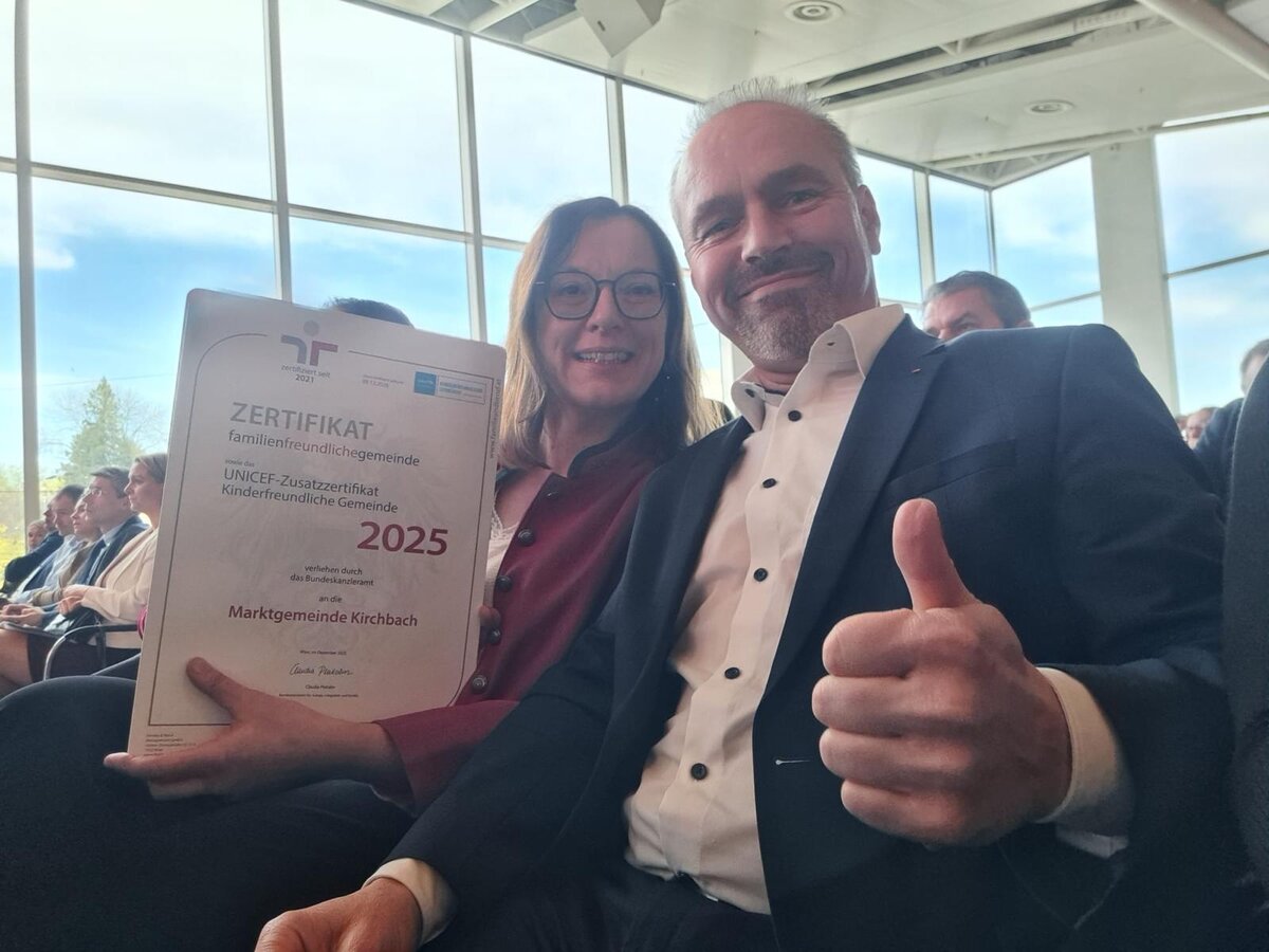 Im Rahmen einer feierlichen Verleihung in Linz nahmen Bürgermeister Markus Salcher und die Auditbeauftragte, Gemeinderätin Barbara Plunger, das Zertifikat persönlich entgegen. Diese erneute Auszeichnung unterstreicht das große Engagement der Menschen unserer Gemeinde in diesem Bereich. Mit ihrem Einsatz leisten sie einen wertvollen Beitrag, dass Kirchbach ein lebenswerter Ort für Familien ist und bleibt. Wir danken allen herzlich, die zu diesem Erfolg beigetragen haben, und freuen uns darauf, gemeinsam weitere Schritte in Richtung eines noch familienfreundlicheren Kirchbachs zu setzen.