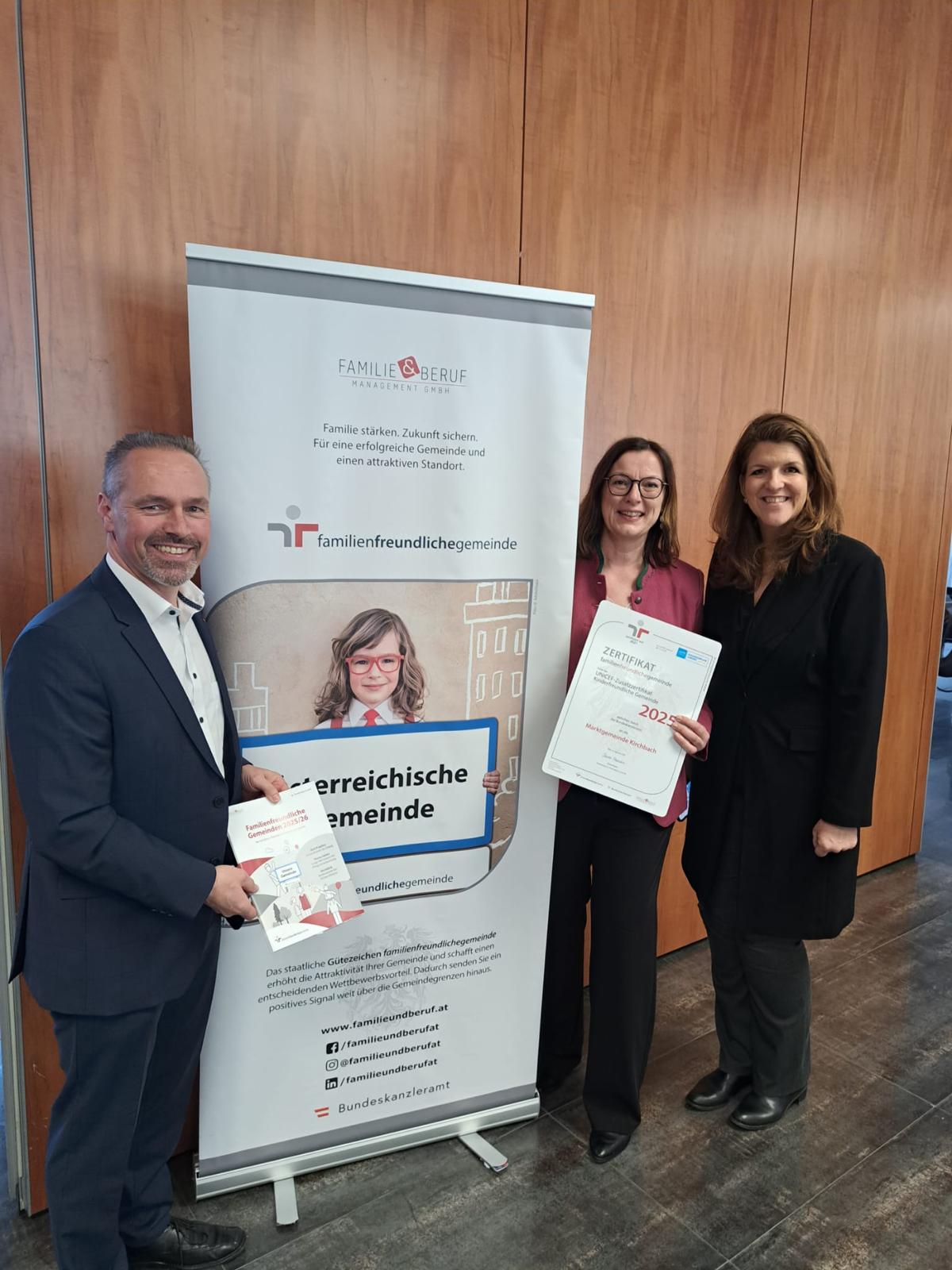 Im Rahmen einer feierlichen Verleihung in Linz nahmen Bürgermeister Markus Salcher und die Auditbeauftragte, Gemeinderätin Barbara Plunger, das Zertifikat persönlich entgegen. Diese erneute Auszeichnung unterstreicht das große Engagement der Menschen unserer Gemeinde in diesem Bereich. Mit ihrem Einsatz leisten sie einen wertvollen Beitrag, dass Kirchbach ein lebenswerter Ort für Familien ist und bleibt. Wir danken allen herzlich, die zu diesem Erfolg beigetragen haben, und freuen uns darauf, gemeinsam weitere Schritte in Richtung eines noch familienfreundlicheren Kirchbachs zu setzen.